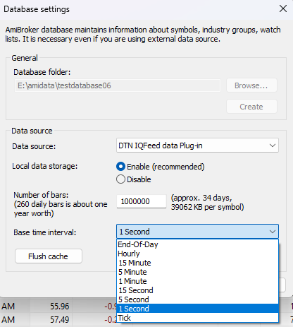 I just set up a new database in Amibroker with 1 million 1-second bars using IQFeed as the data source.