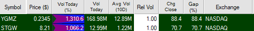 I took this screenshot in the premarket, so you can see that Relative Volume is 1.00 even though both of these stocks have already done far more volume than their 10-day average volume.